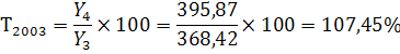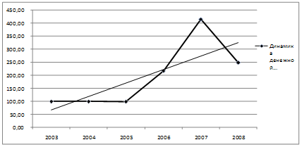 Базисные показатели также говорят о неустойчивой динамике денежной выручки. Например, в 2004 и 2005 годах она была отрицательной по сравнению с 2003 годом, а в 2006, 2007 и 2008 годах уже положительной. Наибольшие изменения были отмечены в 2007 году, здесь максимальный прирост денежной выручки по сравнению с 2003 годом на 414,96%. Менее всего выручка была в 2004 году.