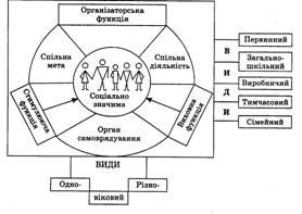 У шкільному колективі, який є формальним утворенням, функціонують різноманітні самодіяльні групи (неформальні дитячі об'єднання), діяльність яких спрямована на реалізацію та розвиток інтересів і потреб їх учасників (64, 314). Формальна група — група, структура і діяльність якої раціонально організовані та стандартизовані згідно з точно приписаними груповими правилами, цілями і ролевими функціями. Ефективність функціонування її забезпечується системою керівництва та контролю. Безпосереднє управління спирається на владні повноваження, розподілені відповідно до формально-статусної структури групи. Неформальна група — самодіяльне об'єднання громадян, статус, структура, функції якого юридично не оформлені. Отже, якщо формальні групи, будучи створеними для певної соціальної діяльності, мають юридично визначений статус, нормативну базу існування, яка закріплює структуру, тип завдань, колективні та індивідуальні права й обов'язки, то неформальні такої регламентації позбавлені.
