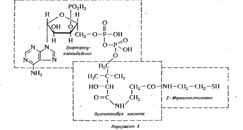 Самым ответственным и наиболее сложным по химической структуре биологически активным производным пантотеновой кислоты является кофермент А, катализирующий различные реакции переноса и присоединения ацильных остатков в процессах жирового и углеводного обмена. Активной группой кофермента, осуществляющей эти реакции, является сульфогидрильная группа 2-меркаптоэтиламина. Строение кофермента А было изучено реакциями его гидролитического расщепления; на основании полученных данных установлена следующая химическая формула: