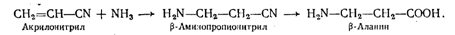 4. Из акрилонитрила аммонолизом с последующим гидролизом b-аминопропионитрила соляной кислотой или щелочью по следующей схеме: