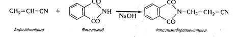 5. Из акрилонитрила аминированием фталимидом в присутствии катализатора с получением в качестве промежуточного продукта фталимидопропионитрила по следующей схеме: