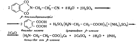 b-Аланин получают в смеси с иминодипропионовой кислотой, из которой его выделяют с выходом и 50%. Метод дает недостаточный выход и усложнен как выделением b-алаиина из реакционной массы, так и синтезом хлорпропионовой кислоты (из акрилонитрила и соляной кислоты).
