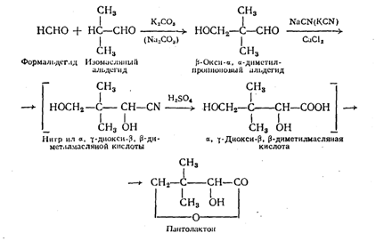 Вторым компонентом молекулы пантотеновой кислоты является пантолактон или (другое название) — a, g-диокси-b, b-диметилмасляная кислота. Синтез пантолактона осуществлен, исходя из изомасляного альдегида, общим методом получения a-окси кислот—циангидринным синтезом по следующей схеме :