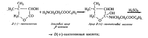 а) при нагревании до 70° С D(—)-пантолактона с этиловым или метиловым эфиром b-аланина с последующим омылением с выходом D(+)-пантотеновой кислоты 50% по схеме: