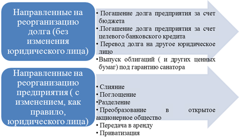К формам проведения санации, которые направлены на реструктуризацию или реорганизацию предприятия-должника относятся: