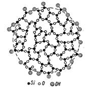Частицы золя шаровидны, состоят из неправильно упакованных кремнекислородных тетраэдров, поверхностный слой которых заканчивается гидроксилами. Схематически строение такой частицы представлено на рис. 1.1 (4).