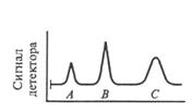 При проведении анализов методом ОФ ВЭЖХ хроматографическую колонку промывают подвижной фазой, обладающей меньшей сорбируемостью, чем любое из разделяемых веществ. При этом подвижную фазу, вводимую в слой неподвижной фазы, называют элюентом, а подвижную фазу, выходящую из колонки и содержащую разделенные компоненты, - элюатом. После промывания в колонку вводят разделяемые вещества, растворенные в элюенте, и продолжают непрерывно пропускать элюент (процесс элюирования). Разделяемые вещества перемещаются вдоль колонки с разными скоростями в соответствии с их сорбируемостью. Если скорости перемещения компонентов достаточно различаются, то на выходе из колонки сначала вместе с элюатом появляется наименее сорбируемый компонент, затем следующий компонент и т.д. Хроматограмма, полученная таким образом, представляет собой несколько пиков, имеющих форму гауссовой кривой (рис. 2.1).