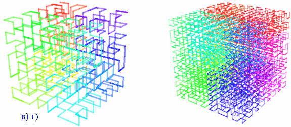 У 1975 році Мандельброт використав слово фрактал як назву для об'єктів, розмірність Хаусдорфа яких є більшою за топологічну розмірність, наприклад Крива Хильберта (мал.3 а,б,в,г).