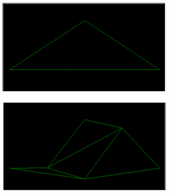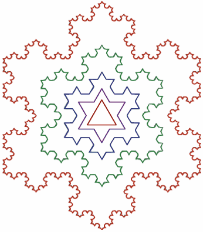 Перший метод — ітераційні функції, які будуються відповідно до фіксованого правила геометричних заміщень, в результаті яких утворюються геометричні фрактали, наприклад: сніжинка Коха (мал.4).