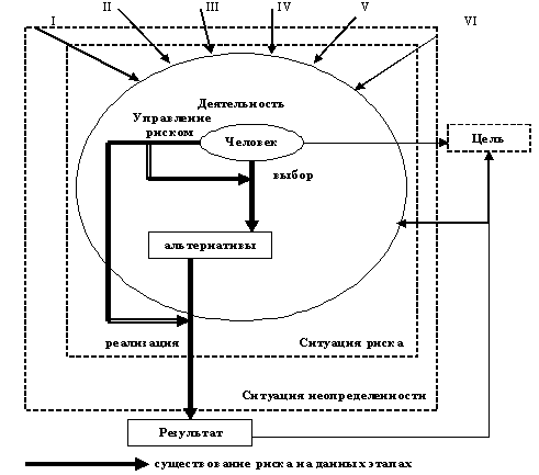 На рисунке 1 изображена схема риска. Помимо самого человека на его деятельность влияют факторы I, II, III, IV, V, VI, создающие в ней ситуации неопределенности и риска. Действия и решения человека могут повлиять как в лучшую сторону на результаты деятельности, так и в худшую, разрядить ситуацию неопределенности, изменить цель проекта. Риск существует как на этапе выбора действий (принятия решений), так и на этапе реализации проекта.
