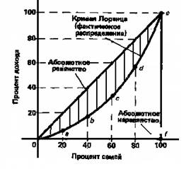 Теоретическая возможность абсолютно равного распределения дохода представлена биссектрисой, которая указывает на то, что любой данный процент семей получает соответствующий процент дохода. Это значит, что если 20, 40, 60% семей получает соответственно 20, 40, 60% от всего дохода, то соответствующие точки будут расположены на биссектрисе. Кривая Лоренца представляет собой кумулятивное распределение численности населения и соответствующих этой численности доходов. В результате она показывает соотношение процентов всех доходов и процентов всех их поручателей. Если бы доходы распределялись равномерно, то есть 10% получателей имели бы десятую часть доходов, 50% - половину и так далее, то такое распределение имело бы вид линии равномерного распределения. Неравномерное распределение характеризуется кривой Лоренца, то есть линией фактического распределения, стоящего от прямой тем дальше, чем больше дифференциация. Например, 20% населения с самыми низкими доходами получили 5% общего дохода, 40% с низкими доходами - 15% и так далее.