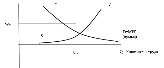 Равновесная ставка заработной платы и равновесный уровень занятости данного вида труда определяется на пересечении кривых предложения и спроса на труд. На рисунке 1.2 равновесная ставка заработной платы - Wc, а количество нанятых рабочих Qc.