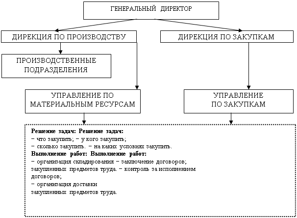 Задачи «у кого закупать» и «на каких условиях закупать» решаются дирекцией по закупкам. Здесь же выполняются и перечисленные работы по снабжению, т.е. заключаются договоры, контролируется их исполнение. В результате функция управления материальным потоком в процессе снабжения предприятия сырьем и материалами разделена между различными службами и ее эффективная реализация затруднена.
