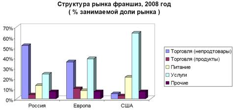 Как видно из представленных в диаграмме данных сектор торговли продуктами питания не занимает ведущего места в структуре франчайзингового рынка. Это связано в основном со спецификой самого продукта, необходимостью установления жестких стандартов логистики и обмена данных, определенными трудностями исполнения стандартов на местах и осуществлением контрольной функции особенно в крупноформатном и широко ассортиментом секторе. Наиболее приемлемым для торгового франчайзинга является сектор специализированной торговли с ограниченным ассортиментом товаров (например, чай, сыры, замороженные продукты и др.). Этот вывод подтверждается не только зарубежной практикой, но и перераспределением в 2008 году франшиз внутри продуктового сектора в России в пользу специализированной торговли.