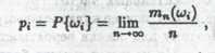 Апостериорно-частотный подход к вычислению вероятностей Р{wi} отталкивается, по существу, от определения вероятности, принятого так называемой частотной концепцией вероятности. В соответствии с этой концепцией вероятность Р{wi} определяется как предел относительной частоты появления исхода в процессе неограниченного увеличения общего числа случайных экспериментов n, т.е. (4)
