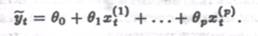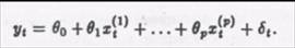 Здесь yt - значение результирующей (объясняемой) переменной, измеренное в t-u временном (или пространственном) такте, хt(1),хt (2)…хt (р) - значения участвующих в соотношении объясняющих переменных, полученные в том же t-м измерении, θ1, θ2,..., θt - некоторые параметры (как правило, не известные до проведения соответствующего статистического анализа), δ t - случайная составляющая, характеризующая разницу между модельный и наблюденным значениями анализируемой результирующей переменной, зафиксированную в t-м измерении. Под модельный значением результирующей переменной ỹt здесь и в дальнейшем мы будем понимать ее значение, восстановленное по заданным величинам объясняющих переменных при условии, что коэффициенты θ 1, θ 2,..., θp нам известны, т.е.