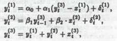 Присутствие в уравнениях (6а) и (6б) «остаточных» случайных составляющих δt(1) и δt(2) обусловлено необходимостью учесть влияние соответственно на уt(1) и уt(2) ряда неучтенных факторов. Действительно, нереалистично ожидать, что величина потребления уt(1) будет однозначно определяться уровнями национального дохода (уt(3) ) и подоходного налога (хt(1)); аналогично величина инвестиций уt(2) зависит, очевидно, не только от достигнутого в предыдущий год уровня национального дохода (уt-1(3)) и от величины нормы процента (хt(2)), но и от ряда не учтенных в уравнении ( 6б ) факторов. Полученная модель содержит два уравнения, объясняющие поведение потребителей и инвесторов, и одно тождество. Модель сформулирована для дискретных периодов времени и имеет запаздывание (лаг) в один период для отражения воздействия национального дохода на инвестиции.