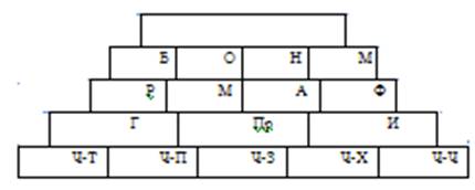 В отечественной психологии наибольшую известность получила классификация профессий, разработанная Е.А. Климовым. Схематично эту классификацию можно представить в виде пирамиды из четырех ярусов: типы профессий, классы профессий, отделы профессий. Пустой прямоугольник на вершине предназначен для обозначения будущей профессии человека (11, с.37).