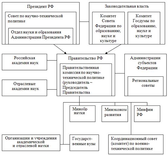 Основным органом, координирующим деятельность министерств и ведомств в научно-технической и инновационной областях, является Правительственная комиссия по научно-технической политике, которую возглавляет непосредственно Председатель Правительства.