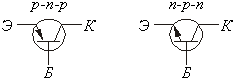 Для величин, що відносяться до бази, емітера і колектора, застосовують як індекси букви “б”, “е” і “к”. Струми в дротах бази, емітера і колектора позначають відповідно iб, iэ, iк. Напруга між електродами позначають подвійними індексами, наприклад напруга між базою і емітером Uб-э , між колектором і базою Uк-б . На умовному графічному позначенні (мал.2) транзисторів p–n–p і n–p–n стрілка показує умовний (від плюса до мінуса) напрям струму в дроті емітера при прямій напрузі на емітерному переході.