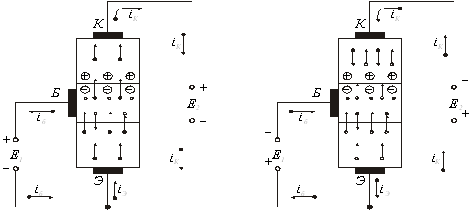 Подібні ж процеси відбуваються в транзисторі типа p–n–p, але в нього міняються ролями електрони і дірки, а також змінюються полярності напруги і напряму струмів(мал. 3). У транзисторі типа p–n–p з емітера в базу інжектуются не електрони, а дірки, які є для бази неосновними носіями. Із збільшенням струму емітера більше таких дірок проникає через базу до колекторного переходу. Це викликає зменшення його опору і зростання струму колектора.