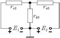 Напруга E2 розділиться навпіл, напруга на Rн і на r0 буде по 6 В.
