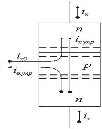 Розглянемо співвідношення між струмами в транзисторі. Струм емітера управляється напругою на емітерному переході, але до колектора доходить декілька менший струм, який можна назвати керованим колекторним струмом iк. упр.. Частина інжектованих з емітера в базу носіїв рекомбінує, тому
