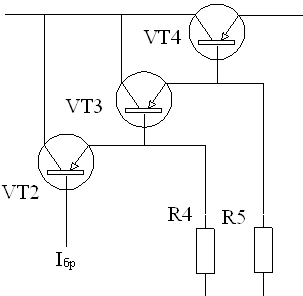 Количество транзисторов входящих в составной зависит от максимальной величины тока коллектора транзистора VТ4 Iк4max и тока коллектора транзистор усилителя VT6 Iку. Их число должно быть таким, чтобы ток базы составного транзистора Iбр был на порядок меньше тока коллектора Iку. Так, как в качестве VT6 используется маломощные транзисторы и величина тока Iку составляет 2¸5мА, то соответственно ток Iбр должен быть равен 0,2¸0,5 мА. Из рассчитанных данных видно, что необходим транзистор VТ3.