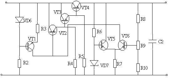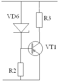 Токостабилизирующий двухполюсник состоит из транзистора VT1, резисторов R2 и R2 и стабилитрона VD6.