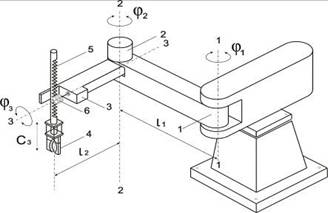 1. Конструктивная схема (рис. 1) промышленного робота (ПР) с грузоподъемностью от 10 до 30 кг, используемого в сборочных операциях в автомобильной промышленности. ПР – автоматическая стационарная машина, имеющая исполнительный механизм (манипулятор) с тремя степенями подвижности. Два механизма поворота, расположенные в шарнирах 1 и 2, осуществляют программные повороты j1(t), j2(t) вокруг вертикальных осей (1–1 и 2–2 соответственно), механизм подъема 3 осуществляет поступательное перемещение С3(t) объекта манипулирования, зажатого в захватывающем механизме 4. В механизме подъема 3 использована зубчато-реечная передача с зубчатой рейкой 5 и зубчатой шестерней 6.