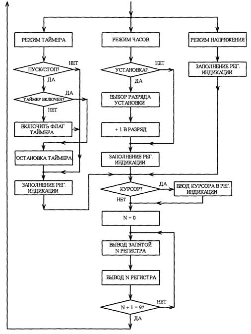 При индикации часов проверяется, был ли ранее введен курсор в поле индикатора. Если значение регистра курсора — ненулевое, то выполняется установка часов. Если при этом нажата кнопка "Установка", то к выбранному разряду прибавляется единица, а регистры индикации заполняются новыми значениями. Если установка отсутствует, то регистры индикации заполняются значениями текущего времени.