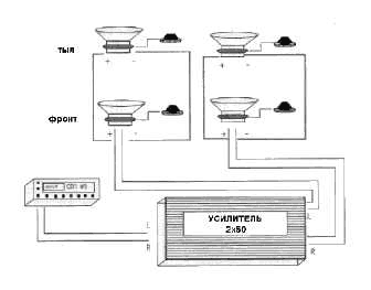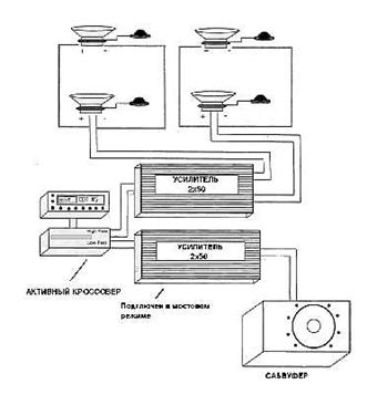 На рисунке показана схема подключения одного двухканального усилителя, к каждому каналу которого подключены две компонентные акустические системы (две вперед и две в заднюю часть салона). Это наиболее простая и дешевая схема усиления без применения активного кроссовера. Обратите внимание, что пара задних динамиков подключаются к основной передней паре параллельно. Параллельное подключение динамиков уменьшает их сопротивление в два раза. Если усилитель имеет полное сопротивление нагрузки равное 4 Ом, то параллельное подключение двух восьмиомных динамиков является вполне приемлемым. Главное при подсоединении динамиков, правильно рассчитать их общее сопротивление. Не следует делать его меньше, чем сопротивление нагрузки усилителя.