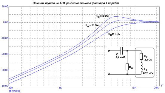 Введение шунтирующего резистора позволяет "приручить" горб на АЧХ, так что на кроссовер можно возложить и некоторые функции эквалайзера. Если шунт сделать на основе переменного резистора (или набора резисторов с переключателем), то можно проводить даже оперативную регулировку АЧХ в пределах 6-10 дБ (рисунок 4).