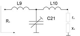 Для согласования коллекторной нагрузки Rк=21,098 Ом с сопротивлением антенны Za=6.468-j152.514 Ом используется Т-образный четырехполюсник (рис 3).