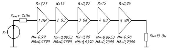 Ом с учётом того, что мы уже рассчитали частотные искажения Мн в области НЧ для всех остальных каскадов и ввели перекоррекцию на НЧ в одном из каскадов.