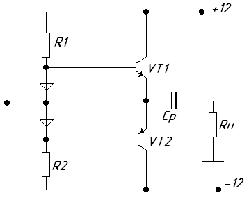 Если Rн< 300÷500 Ом, то нужен каскад по схеме ОК или двухтактный усилитель мощности. В нашем случае будем использовать именно двухтактный УМ.