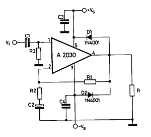 В данном варианте усилителя используем интегральную микросхему A2030H –усилитель мощности низкой частоты с дифференциальным входом и двухполярным питанием и операционный усилитель 140УД10 в качестве входного, «раскачивающего» более мощную микросхему, каскада. Микросхему A2030H и её характеристики мы нашли в литературе (5). Будем использовать стандартную схему включения микросхемы.