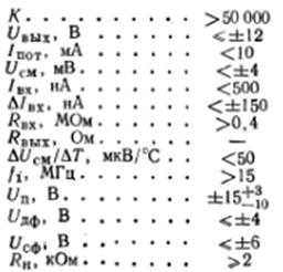Rист=7000 Ом; К0=325; Мн=0,77; Fн=60 Гц; Мв=0,73; Fв=130 кГц; Rн=13 Ом; Кг=1,3; Pвых=3,9 Вт; Uпит= ±12 В; tmax=49°С