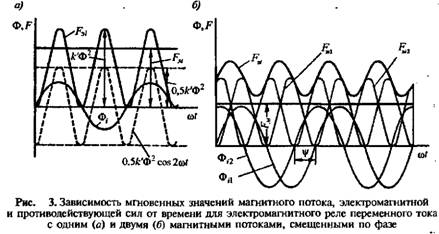 Таким образом, мгновенное значение электромагнитной силы состоит из постоянной и переменной составляющих. В результате их сложения получается электромагнитная сила F3„ изменяющаяся во времени с двойной частотой. При этом в некоторые моменты времени она становится меньше противодействующей силы FM, что вызывает вибрацию якоря. Для устранения вибрации необходимо, чтобы результирующая электромагнитная сила F3i при изменении тока во времени оставалась все время больше противодействующей силы FM.