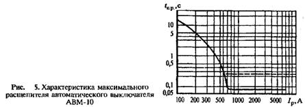 На рис. 5 дана характеристика выдержки времени максимального расцепителя АВМ. При наличии замедлителя расцепления выдержка времени в независимой части может устанавливаться в пределах tc = 0,25...0,4 с или /ср = 0,4...0,6с.
