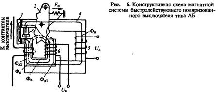 В системах постоянного тока, например на тяговых подстанциях и постах секционирования тяговой сети, в качестве коммутационных аппаратов используют быстродействующие поляризованные автоматические выключатели АБ2/3, АБ2/4, ВАБ-2 и др.. Они конструктивно выполнены так, что сами без специальных расцепителей выполняют и функции защиты, т. е. являются коммутационным аппаратом и первичным реле прямого действия одновременно. Конструктивная схема магнитной системы выключателя показана на рис. 6. Она состоит из сложного магнитопровода 4, подвижного якоря 2 и обмоток 5, б и 7. С якорем связаны главные контакты выключателя, обмотка 7 включается непосредственно в главную цепь защищаемого элемента. Поэтому ток в обмотке определяется режимом работы электроустановки. Он создает магнитный поток Фр, замыкающийся через полюсы магнитопровода. Обмотка б яв ляется включающей. Оперативное напряжение UB подводится к ней кратковременно только в момент включения выключателя. Во включенном положении выключатель удерживается за счет магнитного потока Фд1, являющегося частью магнитного потока Фд, создаваемого током в держащей обмотке 5. Вторая часть Фй этого потока замыкается через левый полюс магнитопровода. Обмотки 5 и 7 включены так, что магнитные потоки Фр и Фд1 в правом полюсе направлены противоположно, а магнитные потоки Фр и Ф^ в левом полюсе направлены согласно. В зависимости от соотношения результирующих магнитных потоков в полюсах якорь 2 может быть притянутым к одному или другому полюсу. В нормальном режиме работы, когда ток в обмотке 7 является током нагрузки, результирующий магнитный поток в правом полюсе превосходит результирующий магнитный поток в левом полюсе. Поэтому якорь 2 после включения вы ключателя остается притянутым к правому полюсу, удерживая контакты замкнутыми. При КЗ ток в защищаемом элементе, а следовательно, и в обмотке 7 резко возрастает. В связи с этим результирующий магнитный поток в правом полюсе уменьшается, а в левом полюсе увеличивается и якорь 2 притягивается к левому полюсу, отключая выключатель. Этому способствует также пружина 3. Полное время отключения, включая и время гашения дуги, составляет не более 0,08 с. При изменении направления тока в обмотке 7 изменит направление магнитный поток Фр и начнет действовать согласно с магнитным потоком Фд1. В этом случае выключатель отключиться не сможет при любых значениях тока в обмотке 7. Таким образом, выключатель является поляризованным, т. е. реагирующим на ток определенного направления, и выполняет функции токовой направленной защиты. Ток срабатывания зависит от величины воздушного зазора между левым полюсом и винтом 8 и регулируется этим винтом. На ток срабатывания оказывает влияние также магнитный шунт 1.