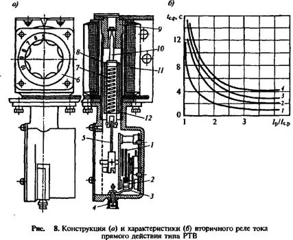 Максимальное реле тока мгновенного действия конструктивно отличается от реле РТВ тем, что не имеет часового механизма. Реле изготовляют на различные токи срабатывания. Например, реле, встроенное в привод выключателя типа ПРБА, позволяет установить ток срабатывания /ср = 5...15 А. Время срабатывания реле РТМ зависит от кратности тока. При кратностях около 2—3 время срабатывания tc р < 0,02 с.