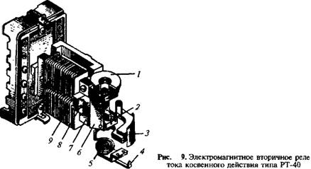 Реле тока РТ-40 используют П-образную магнитную систему с поперечным движением якоря. На полюсах магнитопровода 7 расположены две обмотки реле 9, которые можно соединить между собой последовательно или параллельно. Подвижная система реле состоит из Г-образного стального якоря 6, подвижного контакта 2 и механического гасителя вибрации якоря 1.