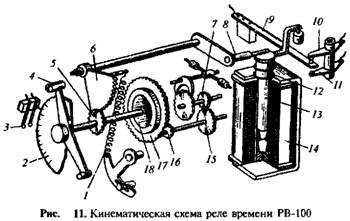 На рис. 11 изображено одно из таких реле типа РВ-100 в отключенном состоянии. При этом ведущая пружина 1 растянута. Она стремится привести во вращение сектор 6, однако этому препятствует палец 8, упирающийся в верхнюю часть якоря 13. При подаче напряжения на обмотку реле 14, достаточного для срабатывания реле, якорь 13, преодолевая противодействие пружины 12, втягивается и убирает препятствие на пути движения пальца 8 и жестко связанного с ним сектора 6, который под действием ведущей пружины 1 начинает вращаться. Это вращение через шестерню 5 передается на валик с укрепленной на нем подвижной частью контакта 4. Начало вращения валика сопровождается сцеплением его с ведущей шестерней 17 посредством фрикционного сцепления 18. Ведущая шестерня 17 через трибку 16 и промежуточные шестерни 15 и 7 связана с часовым механизмом. Время срабатывания реле зависит от расстояния между начальными положениями подвижного 4 и неподвижного 3 контактов. Это расстояние изменяется путем перемещения неподвижного контакта по шкале 2, на которой указаны выдержки времени реле в секундах.