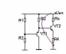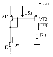 С помощью резистора R1 устанавливается смещение VT2 и потенциал коллектора VT1, причем этот потенциал меньше Uип на удвоенную величину падения напряжения на базо-эмиттерном переходе (при условии, что транзисторыVT1 и VT2 идентичны):
