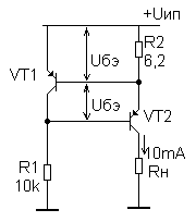 В этой схеме падение напряжения Uбэ VT2 компенсируется падением напряжения на эмиттерном переходе VT1, который имеет такие же температурные характеристики. Резистор R3 играет роль нагрузки для VT1 и задает ток базы VT2. Варьируя соотношением R1/(R1+R2), можно изменять ток нагрузки.