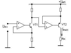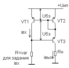 Транзистор VТ1 (n-р-n типа) служит для преобразования входного управляющего напряжения (измеряемое относительно земли) во входное напряжение, измеряемое относительно Uип для оконечного ИТ. Однако следует иметь в виду, что в этой схеме ОУ должен работать при входных напряжениях близких или равных Uип.