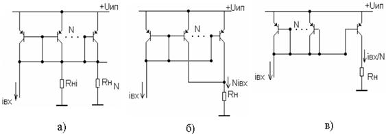 Рисунок 7 – Схемы ИТ с несколькими выходами (а), с умножением (б) и делением (в) токов в нагрузке