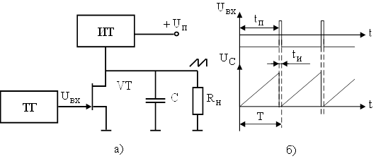 Рисунок 13 – а) Схема генератора пилообразного напряжения: ТГ – тактовый генератор; ИТ – источник тока б) диаграммы напряжений