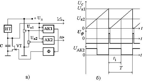 Схема работает следующим образом. В начальный момент времени транзистор VT закрыт и конденсатор С заряжается от источника тока ИТ, формируя линейно нарастающее напряжение, которое одновременно подается на входы компараторов АК1 и АК2. На другие входы компараторов подаются регулируемые напряжения